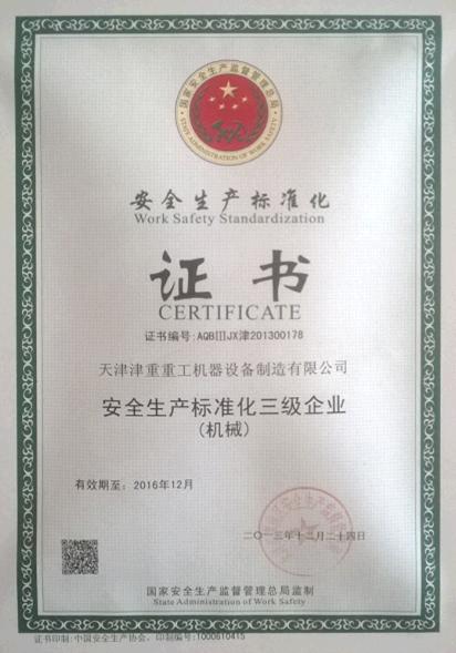 2013 December my company by the Tianjin city Jinnan district administration of work safetyas the standardization of safety production three enterprises (Mechanical) and the issuance of certificates.